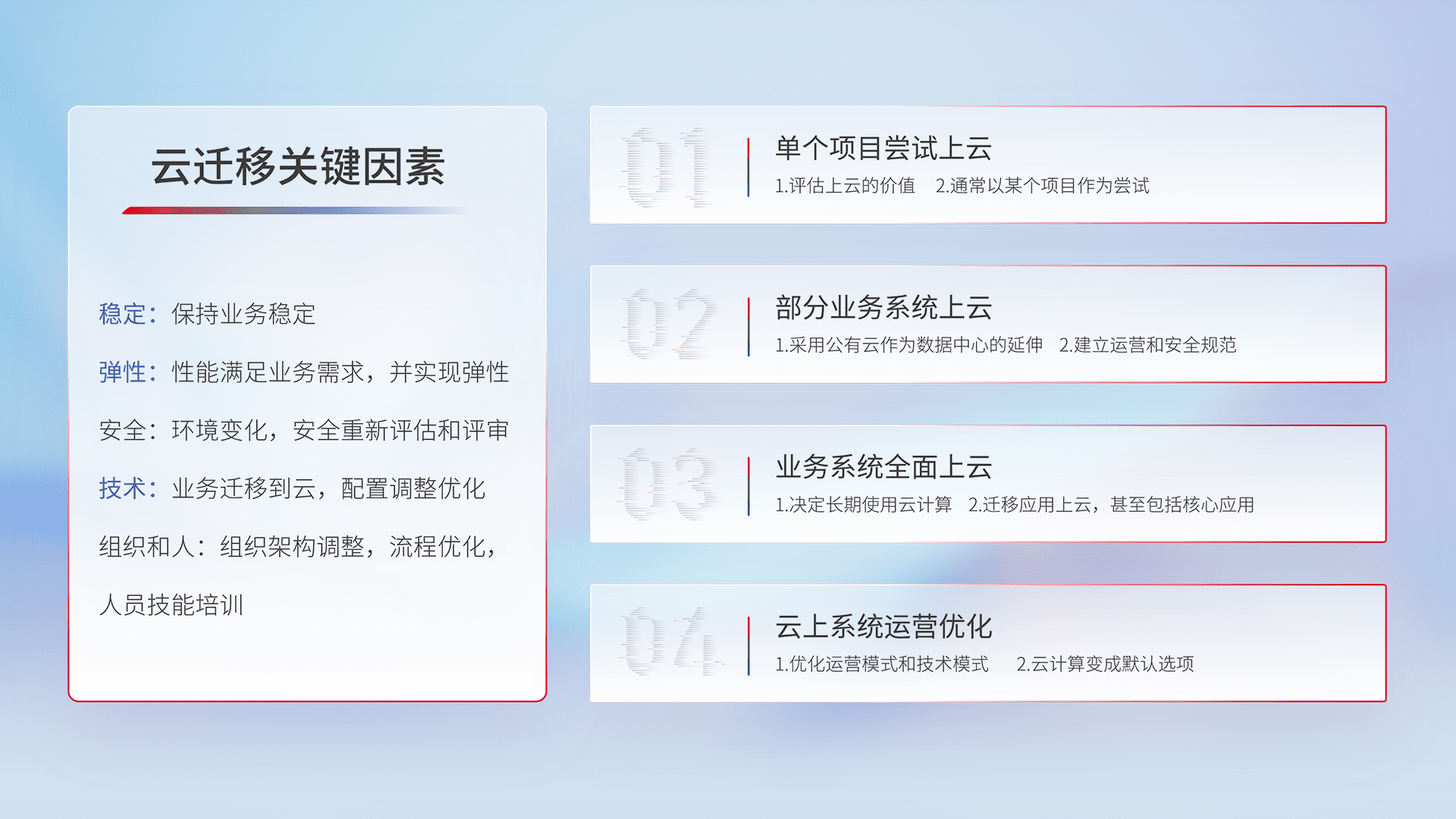 结合实际业务,,,从规划设计、、云平台选型、、云原生改造、、、、数据迁移、、集成交付,,迁移全过程为客户识别最佳上云路径,,做好风险识别管理,,,,设计网络架构、、身份权限、、安全审计合规、、、操作审计、、、、日志审计、、、监控告警策略、、、多站点容灾设计等,,,,对云上基础设施进行整体规划,,提升IT治理水平,,以满足弹性、、、、高可用、、、、高性能的需求。。。