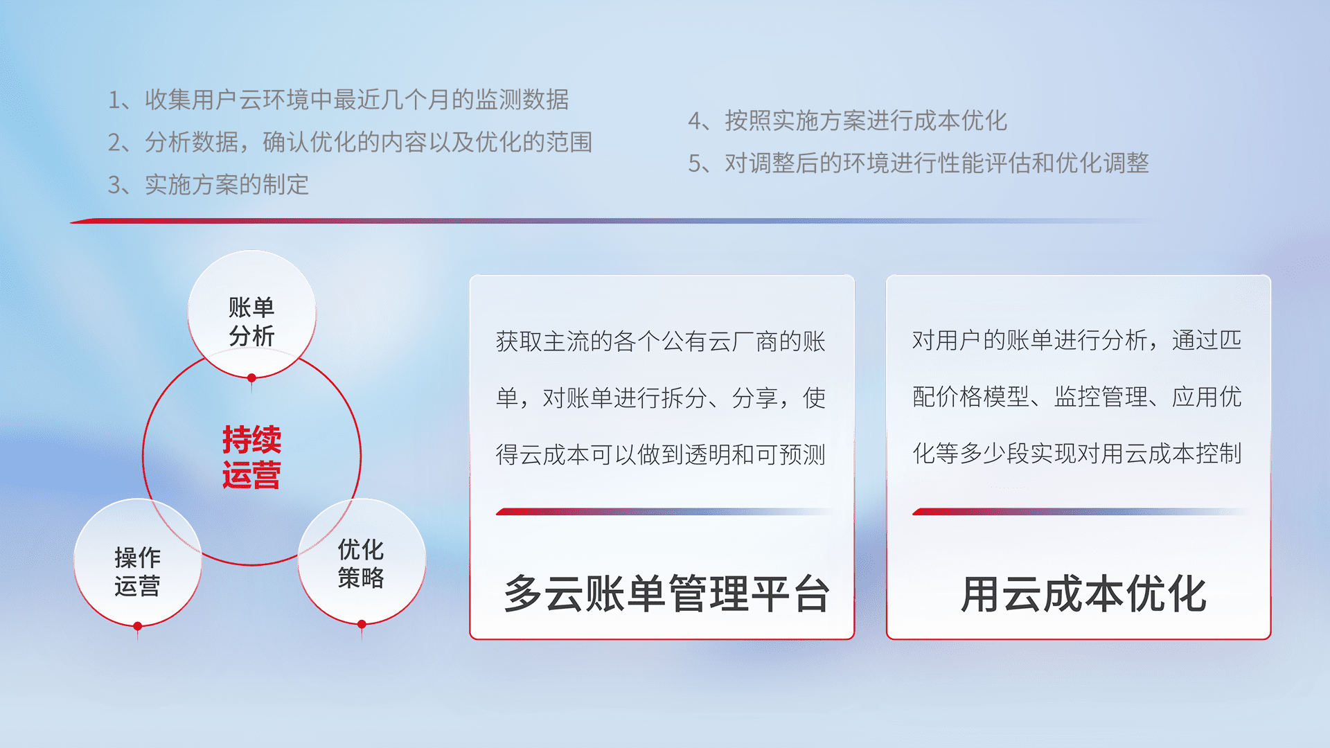 通过多云纳管,,,以统一的资源数据模型把客户的云资源进行抽象和封装,,,进而实现对多云资源的统一操作,,保障云资源管理的可靠性、、、稳定性与可用性。。量身定制化运维内容,,,配置、、开发运维、、、补丁管理、、备份、、、、监控、、、认证和访问管理、、、、审计和日常巡检等,,保障在用云过程中的可靠度,,,,稳定度以及高可用率。。。