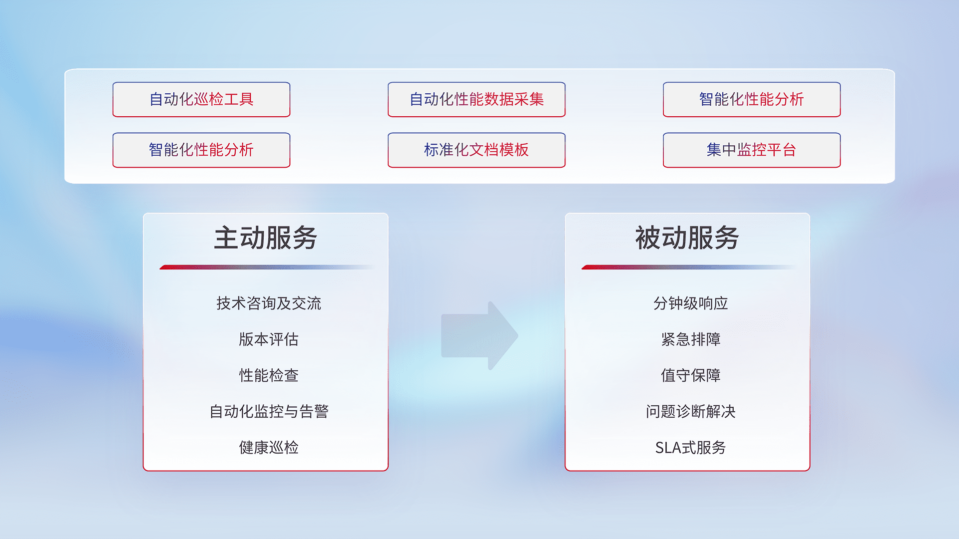 智能化工具和标准化文档,,,,保障服务质量,,提供主动服务(包含技术咨询、、版本评估、、、、性能检查、、自动化监控与告警、、健康巡检)和被动服务包含(分钟级响应、、、紧急排障、、、值守保障、、问题诊断解决、、、SLA服务)。。。。